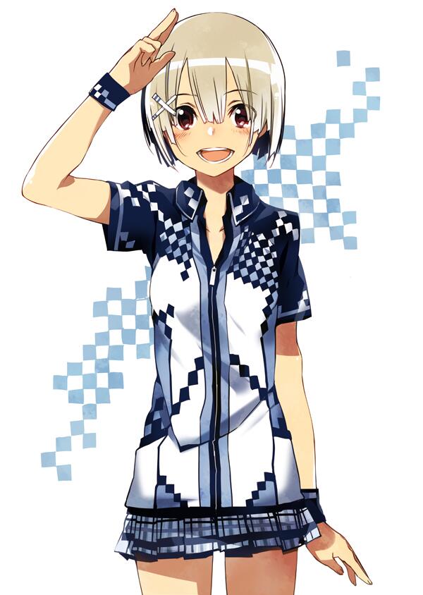 1girlbreastsbrown haircheckered backgroundcowboy shothair ornamentjacketminiskirtopen mouthplaid clothesplaid skirtpleated skirtred eyessaluteshort hairshort sleevesshort-sleeved jacketskirtsmall breastssmilesolowristbandx hair ornament