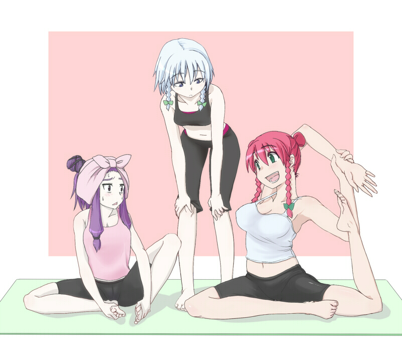 hatsukaze33, hoshizora rin, sonoda umi, tojo nozomi, love live!, love live! school idol project, 3girls, blazer, blue hair, blue jacket, collarbone, grabbing another's breast, green eyes, groping, jacket, lily white (love live!), long hair, multiple girls, open clothes, open mouth, open shirt, orange hair, otonokizaka school uniform, purple hair, school uniform, shirt, short hair, simple background, sweatdrop, white background, white shirt, yellow eyes, yuri