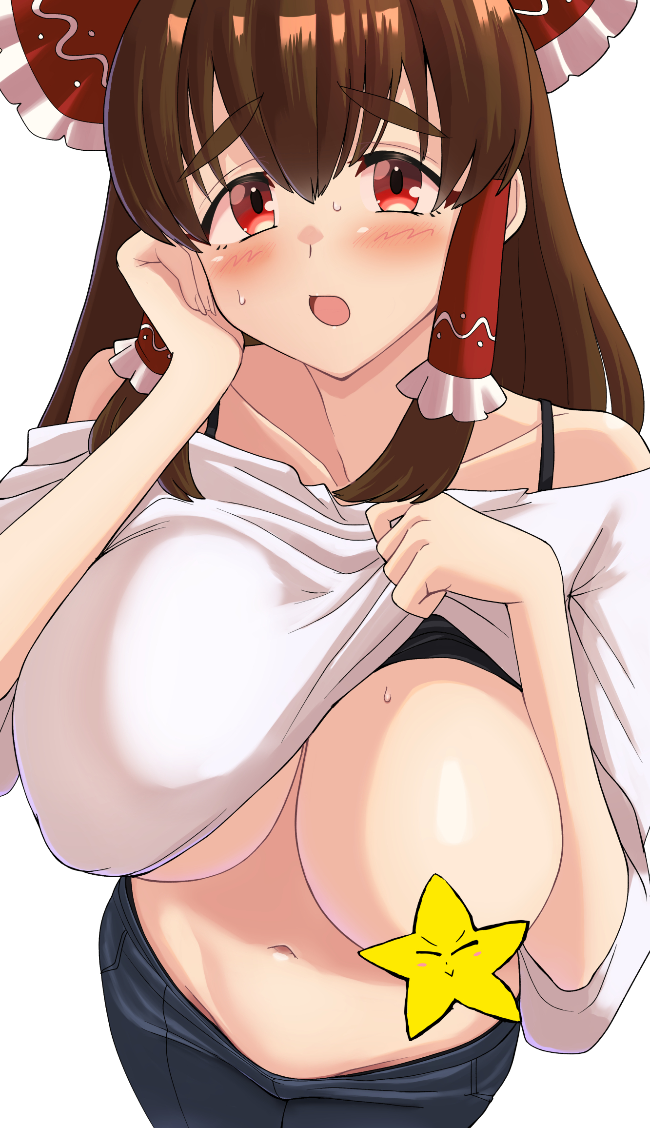 1girlblack brablack pantsblushbowbrabreastsbrown haircensoredclothes liftcowboy shotfrilled bowfrilled hair tubesfrillshair bowhair tubeslarge breastslifting own clotheslong hairlooking at viewernaveloff shoulderoff-shoulder shirtone breast outopen mouthpantsred bowred eyesshirtshirt liftshort sleevessidelockssimple backgroundsolostar (symbol)star censorunderwearwhite backgroundwhite shirt