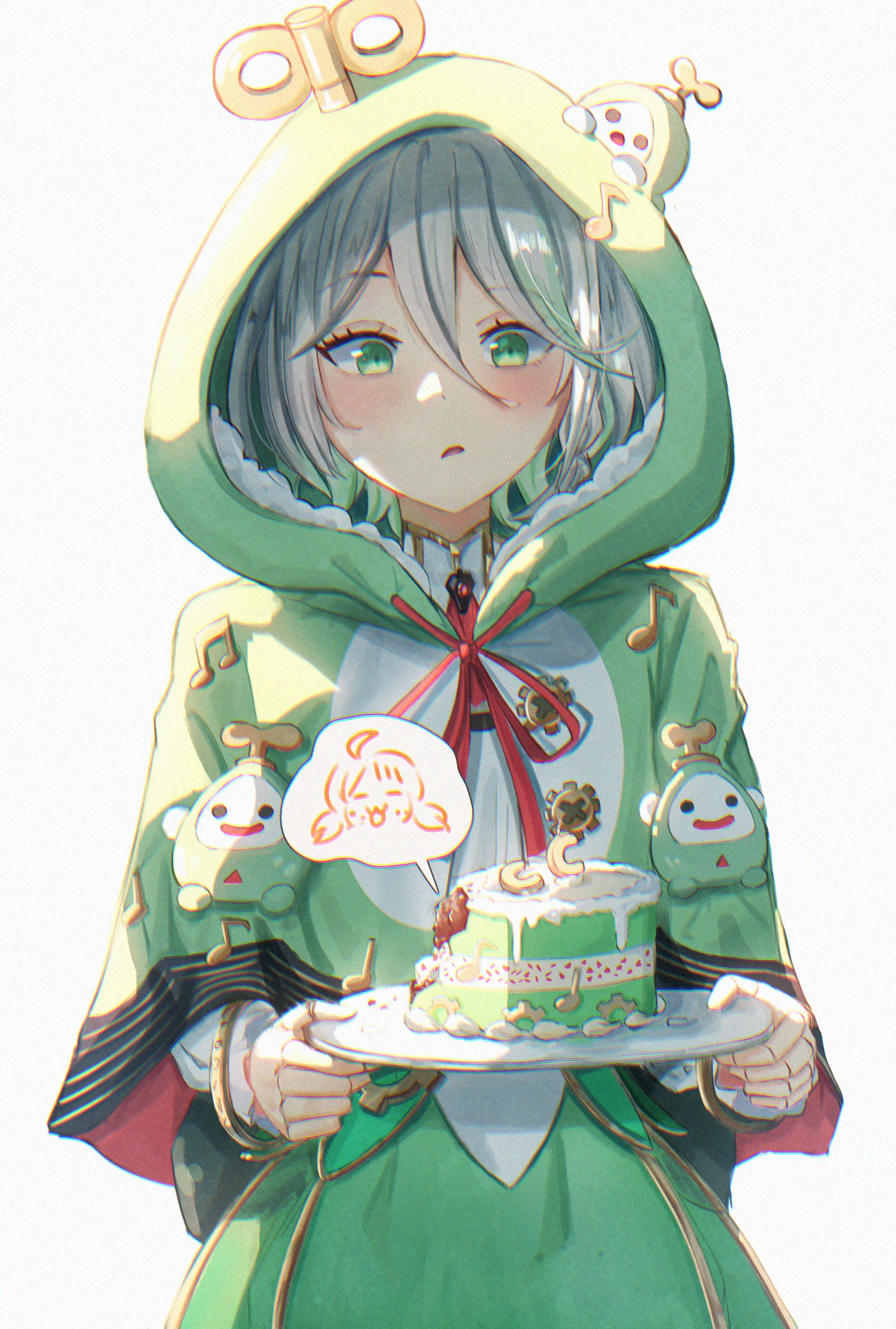 1girlcakecapeletcolored inner hairfoodgreen capeletgreen eyesgreen hairgreen skirtgrey hairhair between eyesholdingholding platehoodhood uphooded capeletmulticolored hairmusical notemusical note printplatesimple backgroundskirtsolospoken characteruwagiruvirtual youtuberwhite background