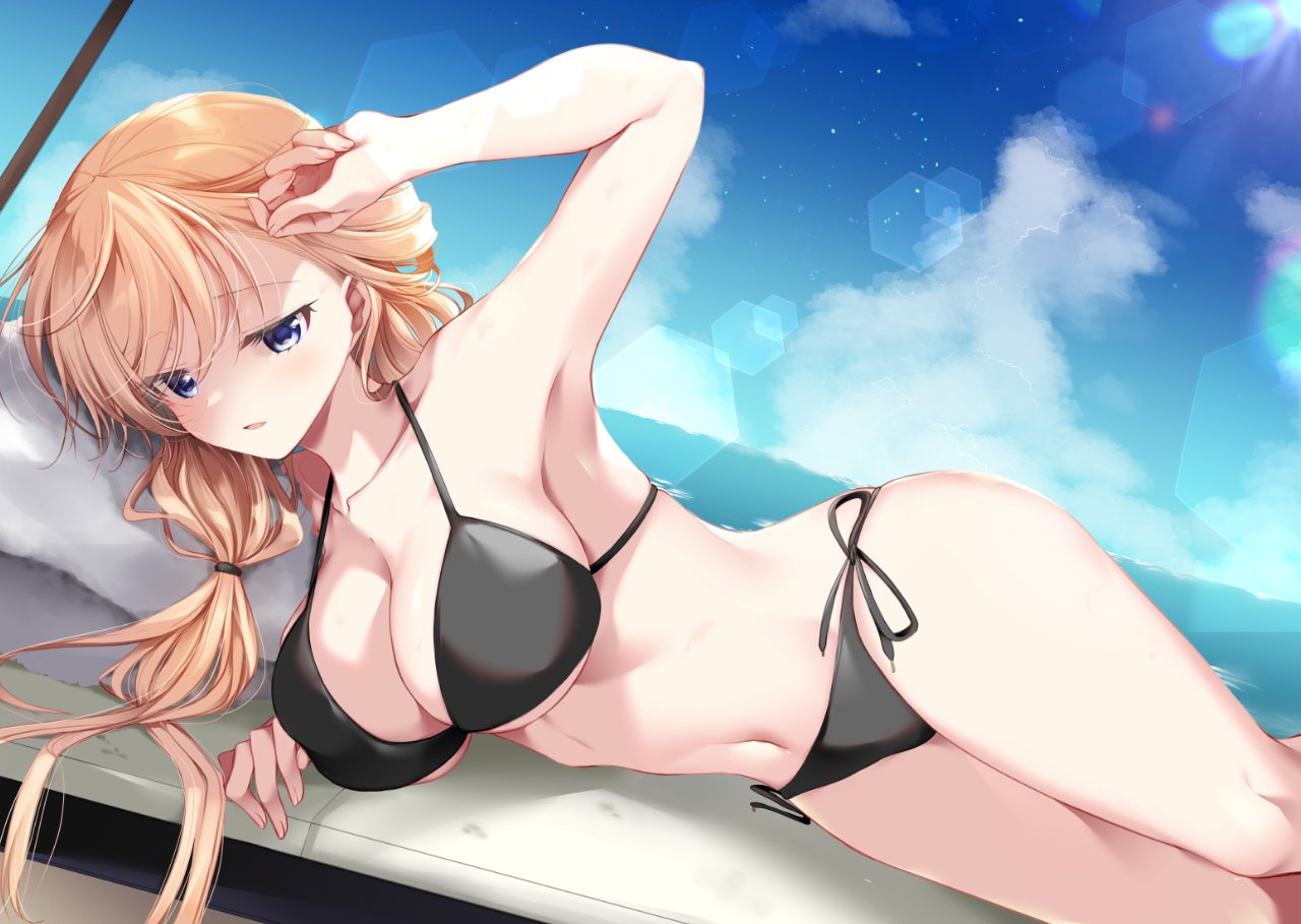 1girlarmpitsartist namebikiniblack bikiniblonde hairblue eyesblue skybreastshand on own headhorizonlarge breastslong hairlooking at viewerlyingnaveloceanon sideparted lipsside-tie bikini bottomskysolostomachswimsuit
