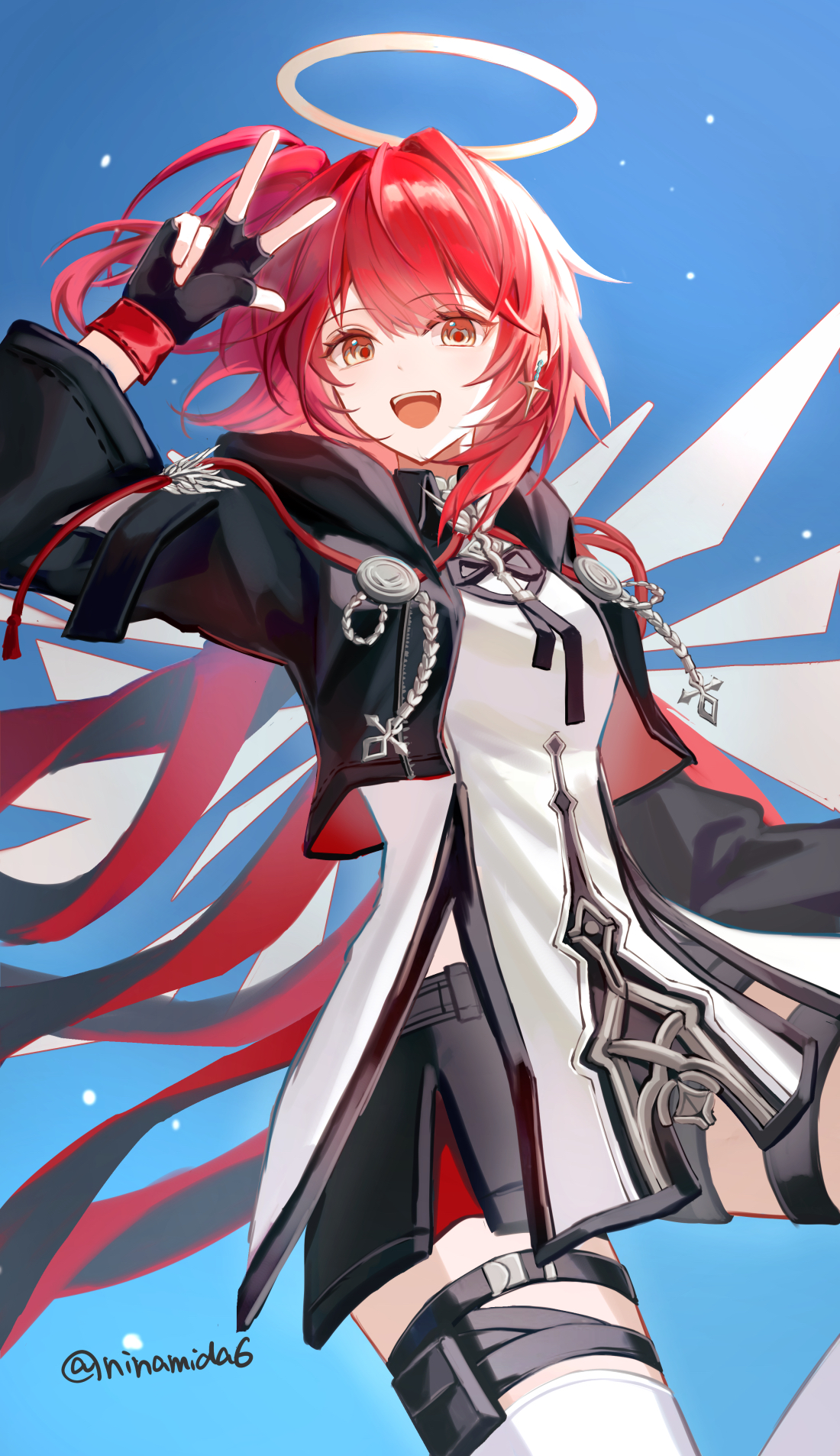 kirisame marisa, touhou, commentary request, 1girl, 222neko, black hat, black vest, blue butterfly, blue sky, bow, braid, broom, bug, butterfly, curtains, feet out of frame, finger to cheek, foliage, hair bow, hat, hat bow, holding, holding broom, insect, light blush, petticoat, puffy short sleeves, puffy sleeves, purple bow, scarf, shirt, short sleeves, single braid, skirt, sky, smile, socks, solo, star (symbol), star print, striped clothes, striped socks, tongue, tongue out, vertical-striped clothes, vertical-striped socks, vest, white bow, white scarf, white shirt, white skirt, window, witch, yellow eyes