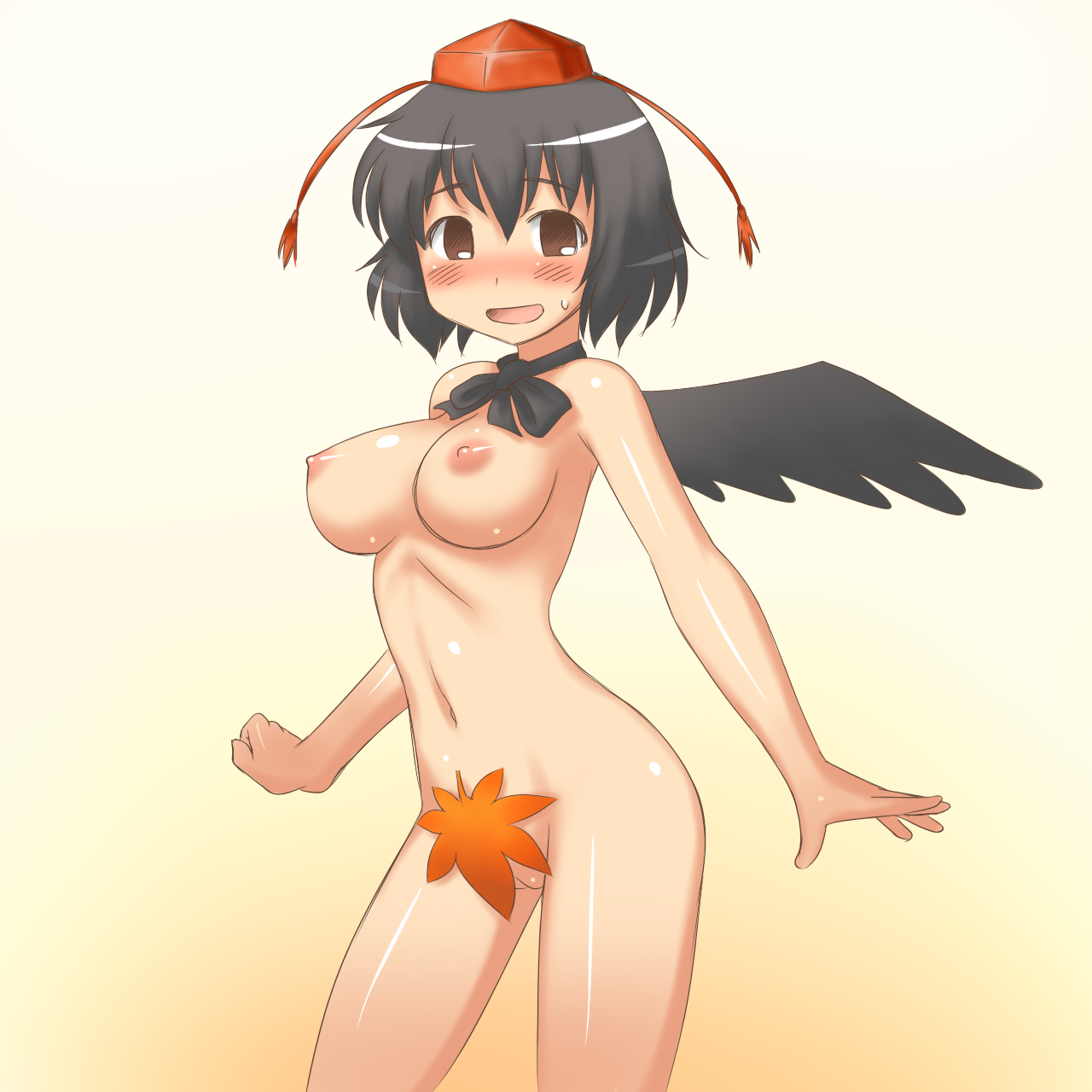 1girlblack wingsblushbreastscensoredcleft of venusembarrassedfemale focushatlarge breastsleaflooking at viewernaked necktienecktienipplesnudeopen mouthpointless censoringpurple hairpussyribbonshiny skinsmilesolosweatuncensoredwings