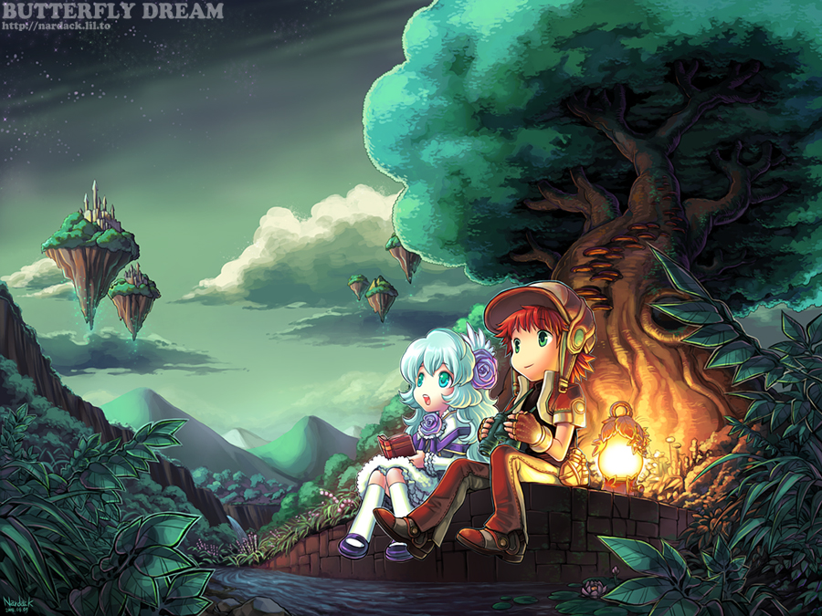 1boy1girlaqua eyesbinocularsbookcloudfantasyfloating islandflowerflying islandsgreen eyeshair flowerhair ornamenthatkneehighslanternmountainred hairrosesceneryskysockstreewatermarkwhite hair