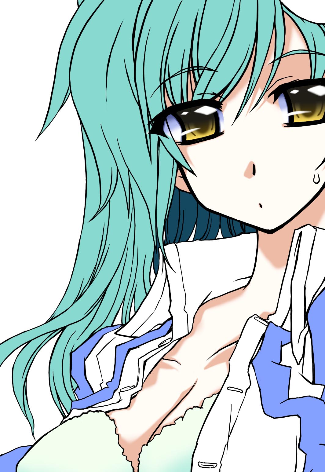 1girlaqua hairbrabreastsfemale focuslingerieopen clothesopen shirtshirtsimple backgroundsolounderwearupper bodywhite background