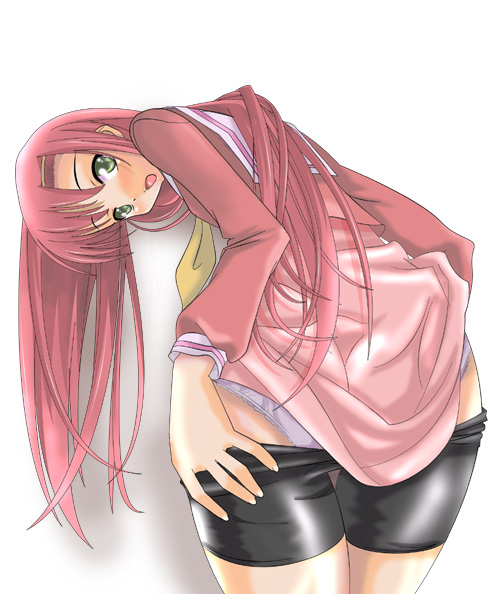 00sbike shortsbike shorts pullblushfrom behindgreen eyeshairbandlong hairpantiespink hairschool uniformserafukuskirtsolounderwearundressing