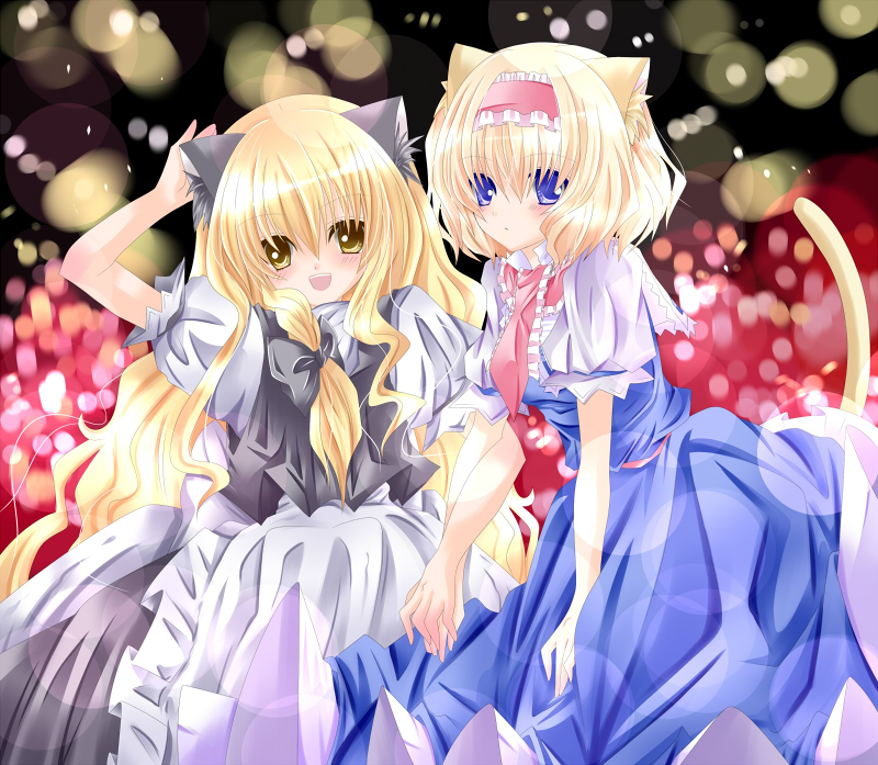 2girlsanimal earsapronarm upblonde hairblue dressblue eyesbowbraidcat earscat girlcat taildressfemale focushair bowhairbandholding handskemonomimi modelong hairmultiple girlsno headwearopen mouthribbonsmiletailyellow eyes