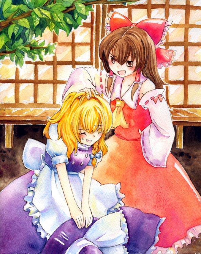 2girlsblonde hairbraidbrown hairdetached sleevesfemale focushatjapanese clotheslong hairmikomultiple girlsone eye closedwinkwitchwitch hatyellow eyes