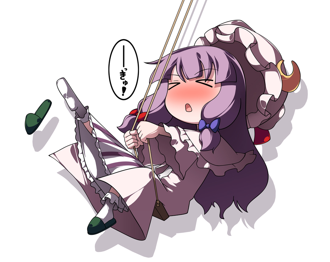 1boy1girlblushchibiclosed eyescrescentfemale focushatlong hairon swingpurple hairslipperssockssoloswingswinging on swing