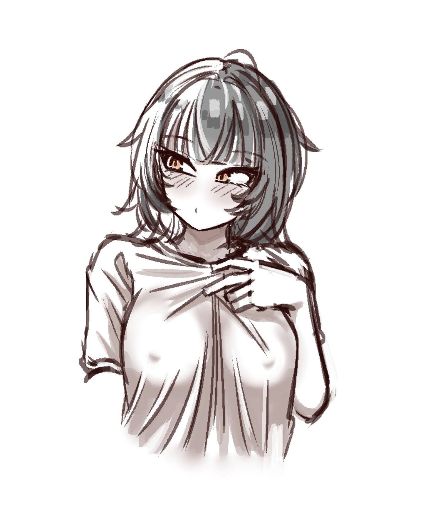 1girlblack hairbreastscovered erect nippleslarge breastslight blushlong hairmulticolored hairshirtsimple backgroundsolosplit-color hairtwo-tone hairvirtual youtuberwhite backgroundwhite hairwhite shirtyellow eyes