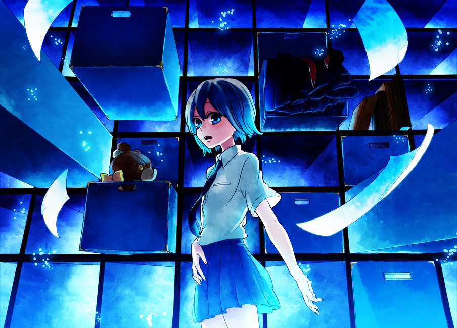1girlblue eyesblue hairblue skirtcabinetfemale focusfile cabinetmatching hair/eyesnecktieopen mouthpleated skirtschool uniformskirtsolostuffed animalstuffed toyteddy bear