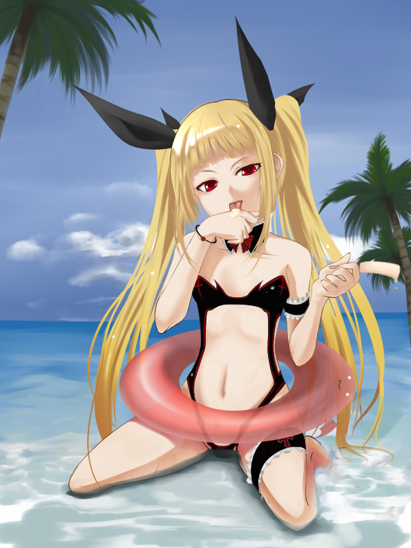 1girlarm garterbeachblonde hairblunt bangsdayfemale focusfoodfrilled thigh strapinnertubekneelinglickinglong hairpalm treepopsiclered eyesribbonsidelockssittingsoloswim ringswimsuitthigh straptreetwintailswariza