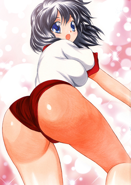 1girlassblack hairblue eyesbreastsburumafemale focusfrom belowgym uniformhuge asslarge breastslooking backopen mouthshort hairsolo