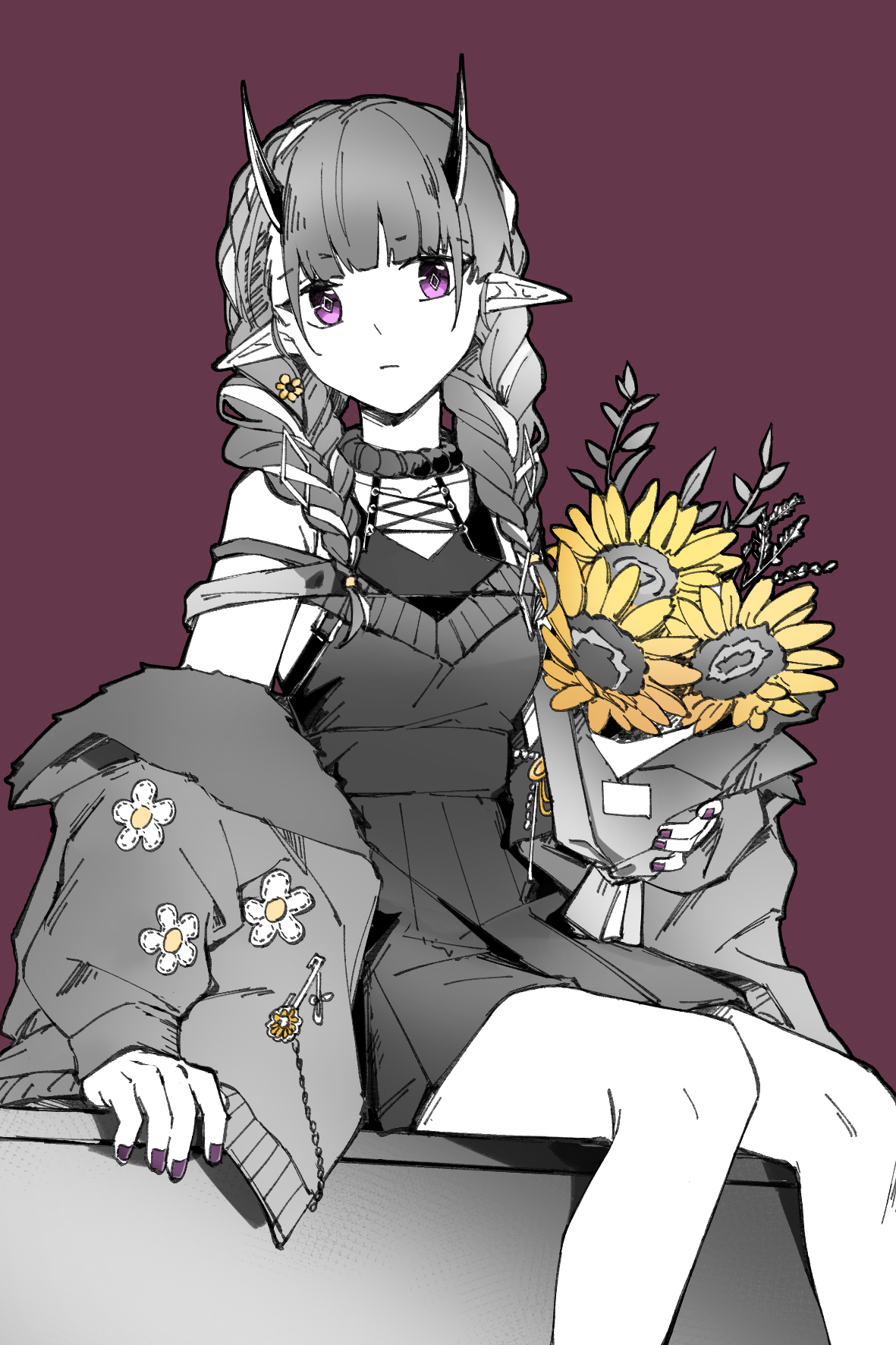 1girlbare shouldersbouquetbraidclosed mouthexpressionlessfeet out of framefingernailsflowerhair flowerhair ornamenthair over shoulderholdingholding bouquethornsjacketmedium hairnail polishoff shoulderpartially coloredpointy earspurple backgroundpurple eyespurple nailssimple backgroundsittingskirtsolosunflowertwin braidsyellow flower
