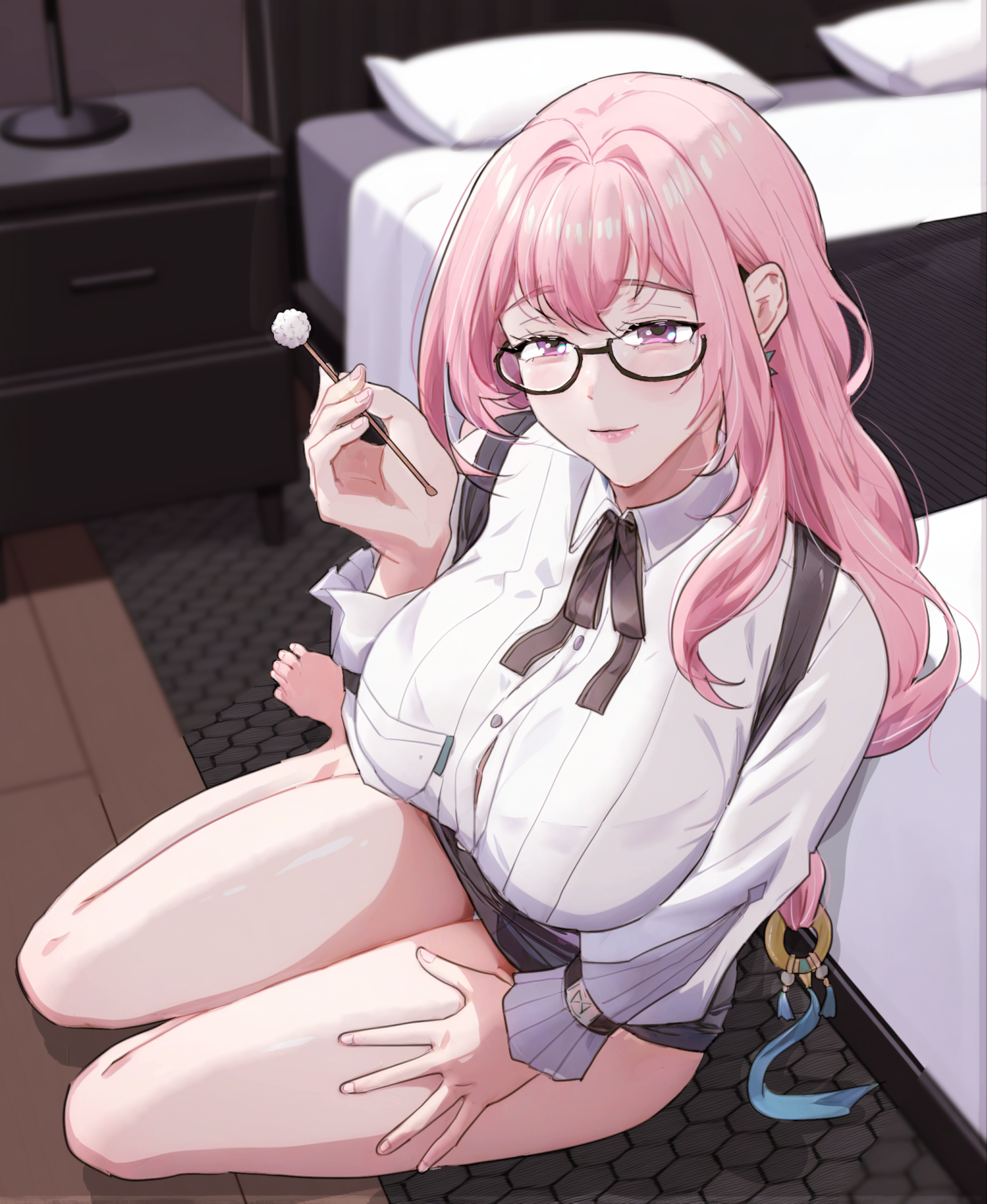 1girlblack skirtblushbreastsclosed mouthglasseshair between eyeslarge breastslong hairpink eyespink hairshirtsidelocksskirtsmilesolowhite shirt