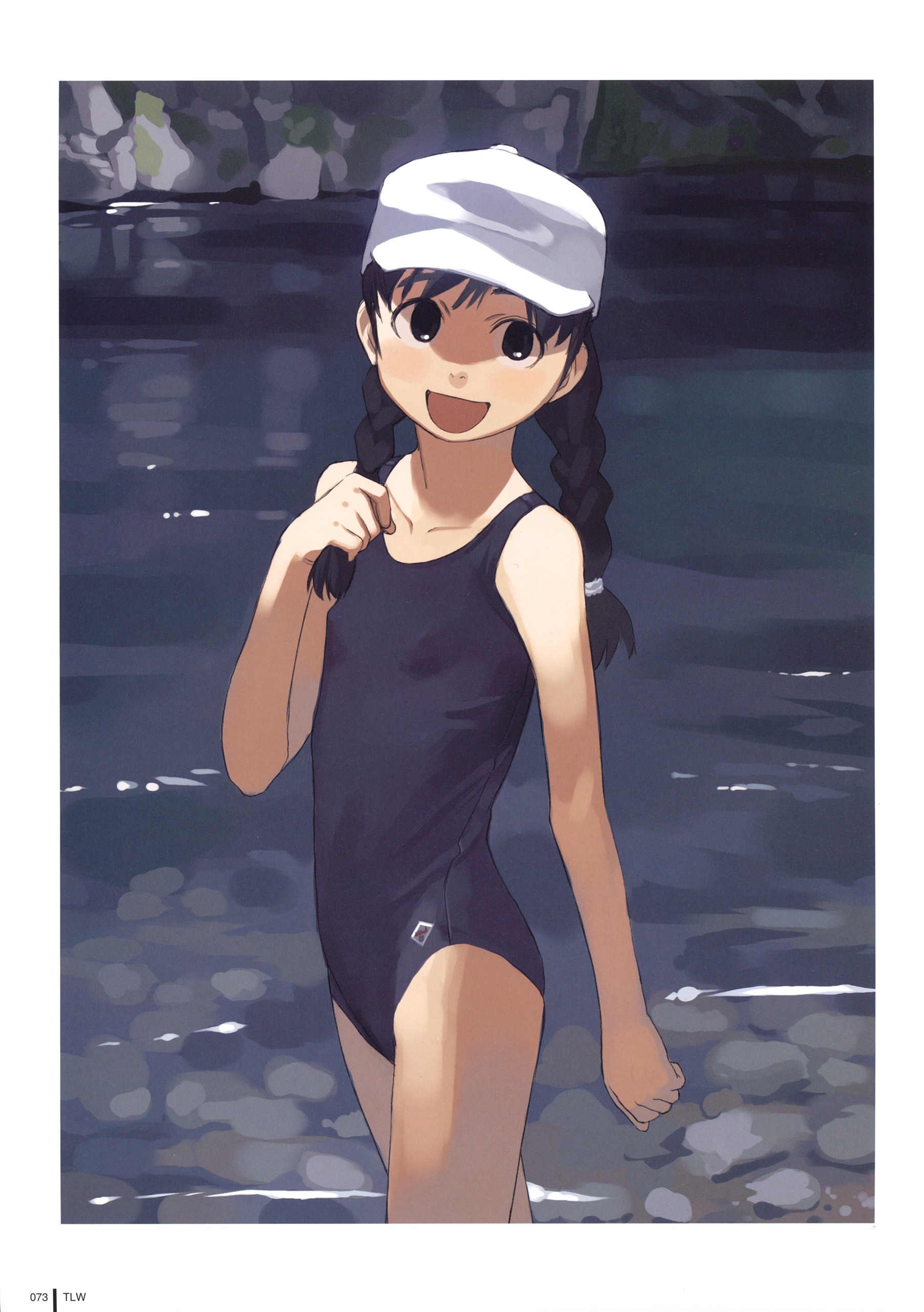 1girlblack eyesblack one-piece swimsuitbraidchildfemale focusflat chestgrey themehatmuted colorone-piece swimsuitschool swimsuitshort hairsmilesoloswimsuittwin braidswater