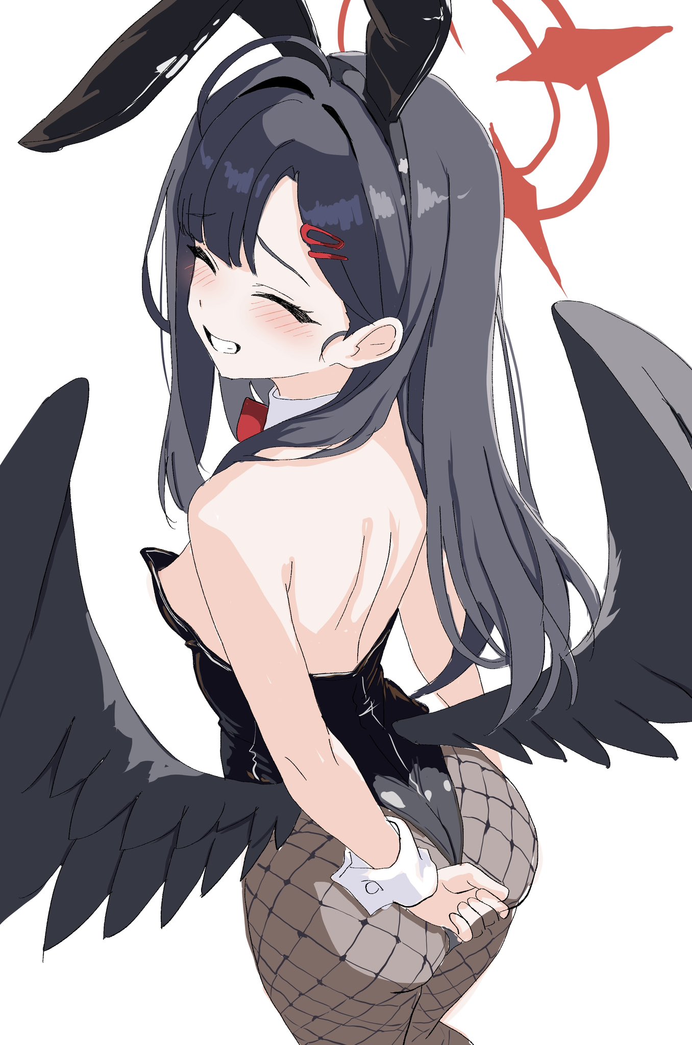 1girlalternate costumeanimal ear hairbandanimal earsassblack hairblack leotardblack wingsblushbowbowtiebreastsclosed eyesdetached collarfake animal earsfake tailfeathered wingsfishnet pantyhosefishnetshair ornamenthairbandhaircliphalohighleghighleg leotardleotardlong hairlooking backlow wingsnipple slipnipplesoversized breast cuppantyhoseplayboy bunnyrabbit ear hairbandrabbit earsrabbit tailred halosimple backgroundsmall breastssmilesolostraplessstrapless leotardtailwhite backgroundwhite wrist cuffswingswrist cuffs