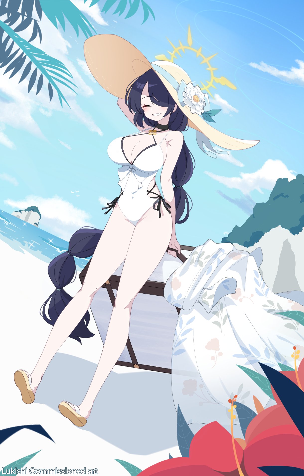 1girlbikiniblack bikinibraidbraided ponytailcasual one-piece swimsuitcriss-cross halterflowerhair over one eyehalohalterneckhathat flowerlayered swimsuitofficial alternate costumeone-piece swimsuitrukakomatsusolosun hatswimsuitwhite one-piece swimsuityellow haloyellow hat