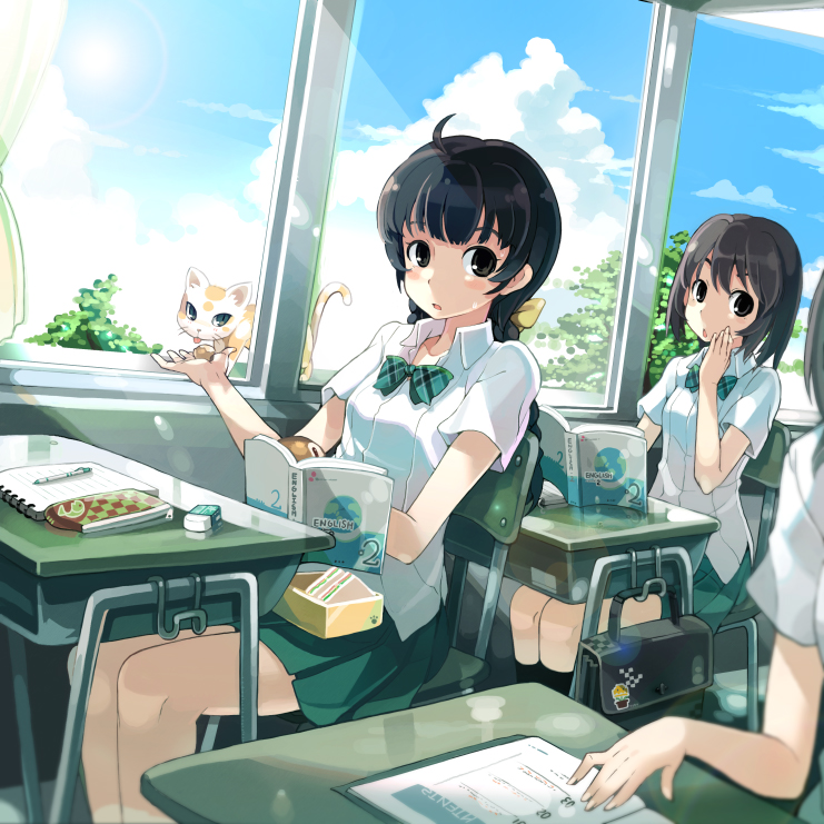 :o2girlsbagblack hairblurrybookcatclassroomclouddaydepth of fielddeskeatingenglish texteraserfeedingfoodindoorslens flaremechanical pencilmultiple girlspencilsandwichsatchelschoolschool deskschool uniformsittingstudyingsunlightwindow