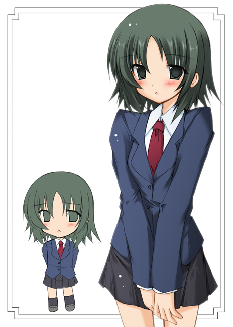 00s1girlarms behind backblack hairblushchibigreen eyesgreen hairnecktieopen mouthschool uniformshort hairskirttriangle mouth