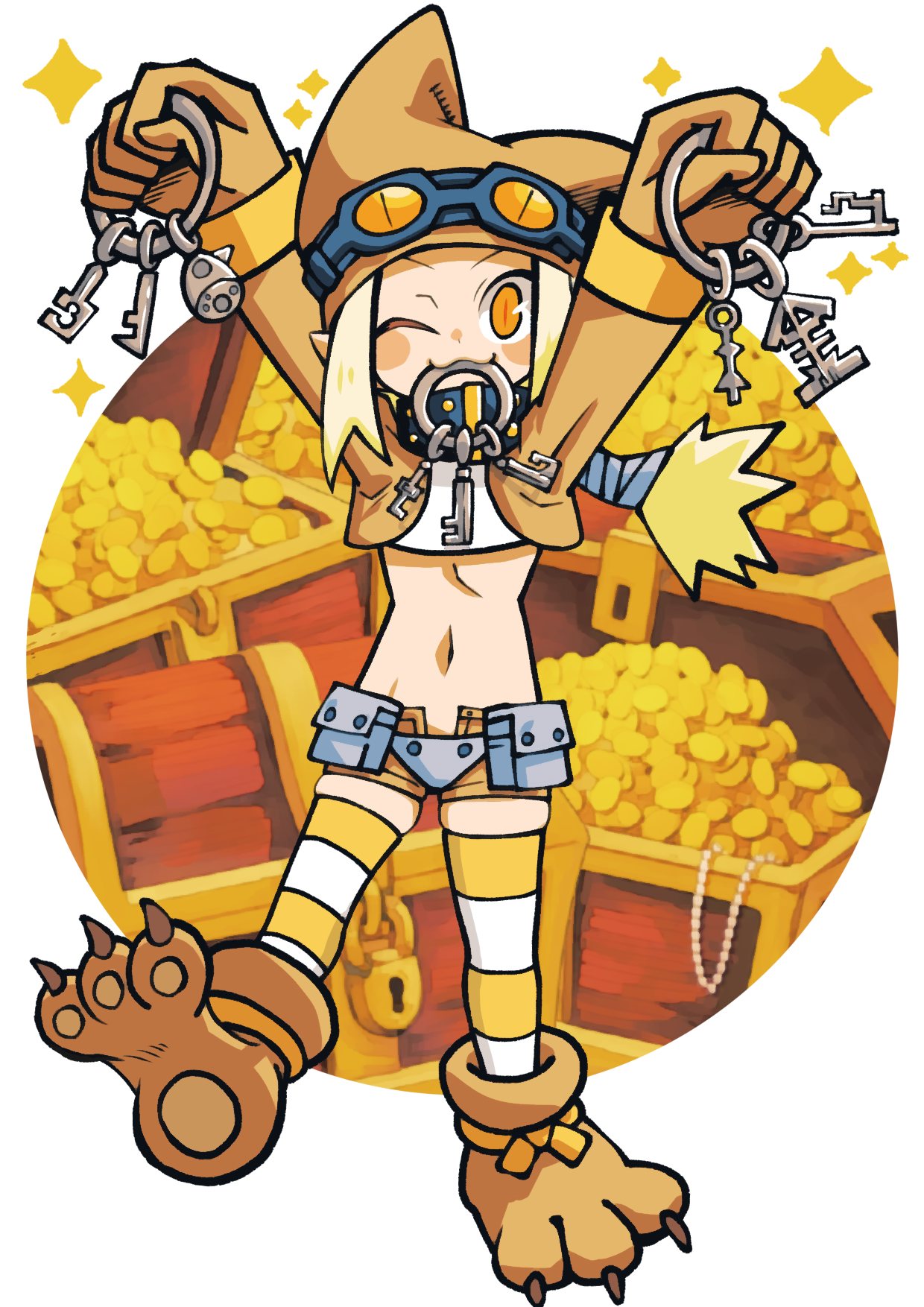 1girlanimal hatblonde hairblushbrown glovesbrown jacketcat hatcrop topcropped jacketglovesgogglesgoggles on headwearhatholdingholding keyjacketkeylow ponytailmidriffnavelone eye closedorange eyespaw shoesponytailslit pupilsstriped clothesstriped thighhighstank topthighhighstreasure chestwhite backgroundwhite tank top