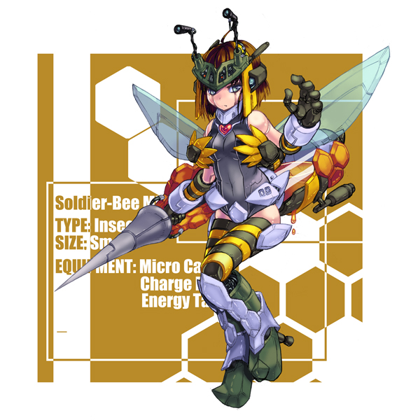 1girlarthropod girlbeebee girlblue eyesbrown hairbugfemale focusfoodhoneyhoneycomb (pattern)honeycomb backgroundinsectinsect girllancemecha musumemonster girlpolearmsolospearweaponwings