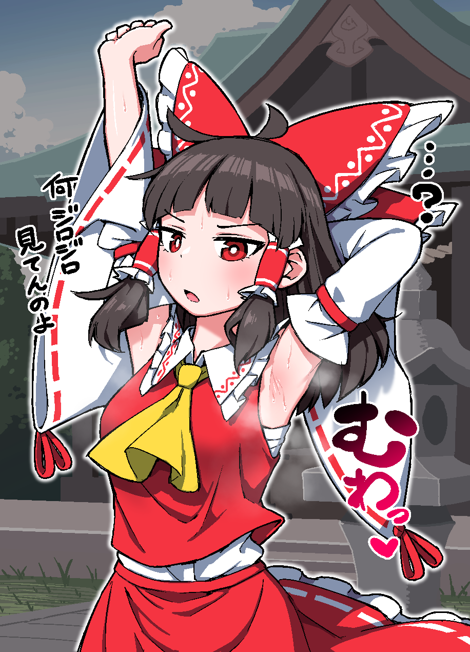 1girlarmpitsascotbowbrown hairbuildingdetached sleevesfrilled bowfrilled hair tubesfrillshair bowhair tubeshakurei shrinelong hairlooking at vieweropen mouthred bowred eyesred skirtribbon trimribbon-trimmed skirtribbon-trimmed sleevesskirtskirt setsolosteamstone lanternstretchingsweatyellow ascot