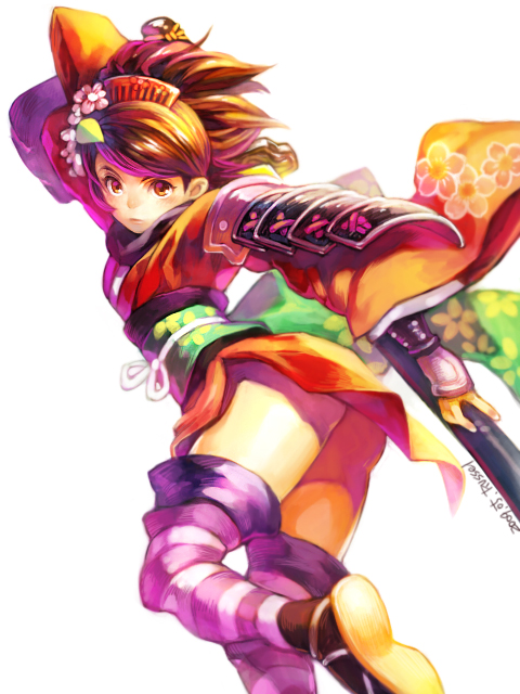 1girlarmorassfemale focushair ornamentjapanese clotheskatanakimonosandalsshort kimonosoloswordthighhighsweapon