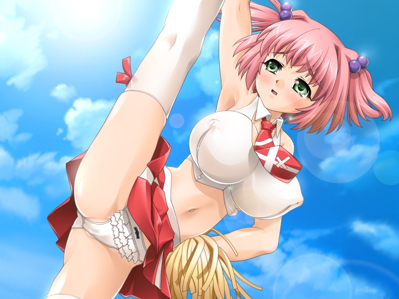 1girlbreast expansionbreastscheerleaderfemale focusimpossible clothesimpossible shirtpantiespink hairshirtskirtskysolospread legsstretchingthighhighsunderwear