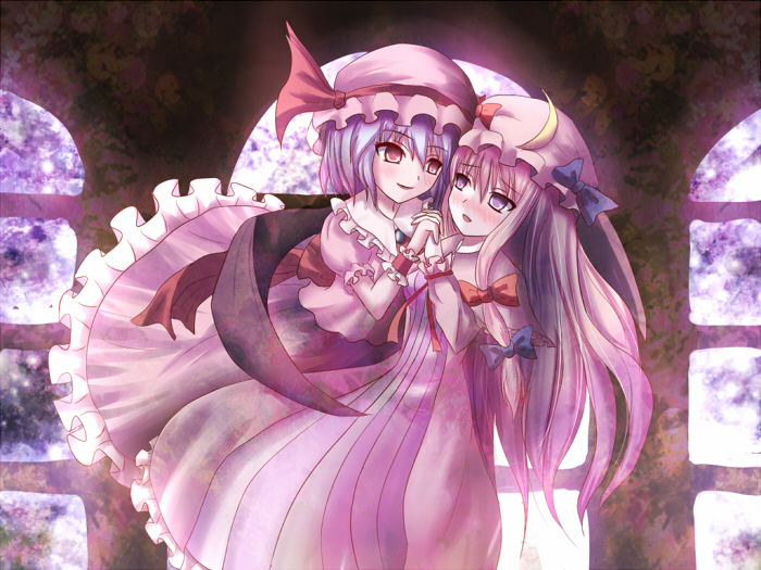 2girlsbat wingsblue hairfemale focushair ribbonhatholding handsmultiple girlspurple eyespurple hairred eyesribbonwings