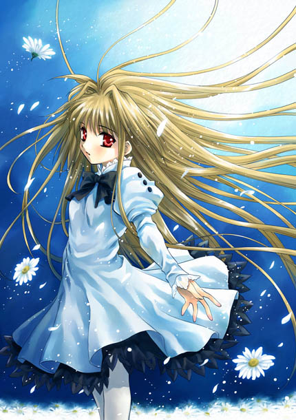 00saged downblonde hairblushdaisy (flower)dressflowerhair spread outlong hairpantyhosered eyesribbonwhite pantyhose