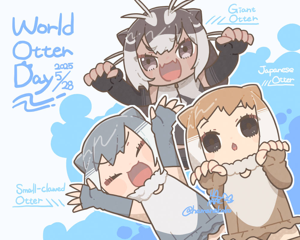 3girlsanimal earsantenna hairarms upblack eyesbrown eyesbrown hairbrown one-piece swimsuitcharacter namechibichibi onlyclaw posedark skindark-skinned femaledouble-parted bangselbow glovesempty eyesenglish textfacing viewerfangsfingerless glovesfur collarglovesgrey hairgrey one-piece swimsuithands uplong hairlooking at viewermulticolored hairmultiple girlsone-piece swimsuitotter earsoutlineoutstretched armsshort hairskin fangssmileswimsuittwo-tone hairtwo-tone one-piece swimsuittwo-tone swimsuitv-shaped eyebrowswhite outlinezipperzipper pull tab