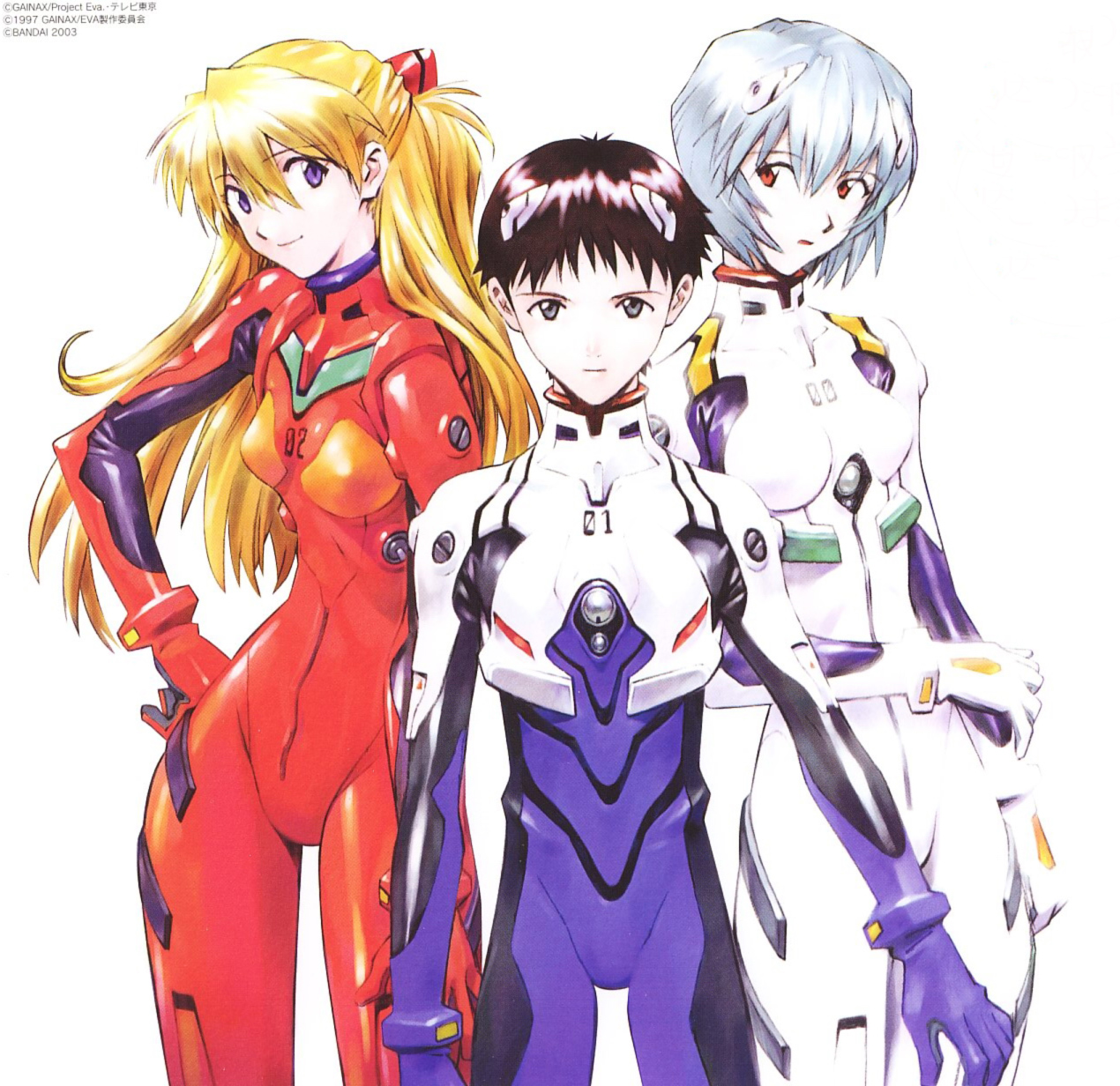 1boy2girlsblack hairblonde hairblue eyesblue hairbracerbreastscompany namecowboy shotdatedglovesgrey eyeshair between eyeshair ornamenthand on own hiphip focusholding own arminterface headset (evangelion)light smilelong hairlooking at viewermecha pilot suitmultiple girlsplugsuit (evangelion)red eyesshort hairsimple backgroundskinnysmall breastssmileturtleneckwhite background