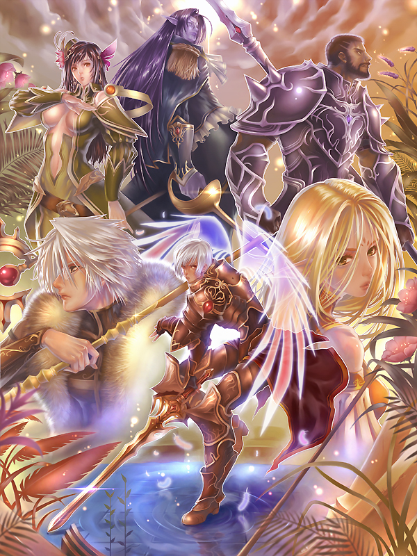 2girls4boysarmorblonde hairbrown hairfantasyflowerglasseslong hairmultiple boysmultiple girlspointy earsshort hairswordwarriorweaponyellow eyes