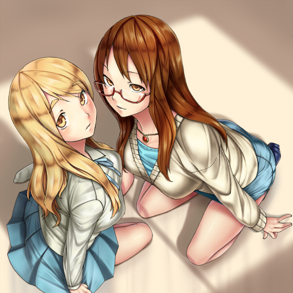 00s2girlsblonde hairbrown eyesbrown hairfrom aboveglassesjewelrykneelinglong hairmultiple girlsnecklaceschool uniformshadowyellow eyes