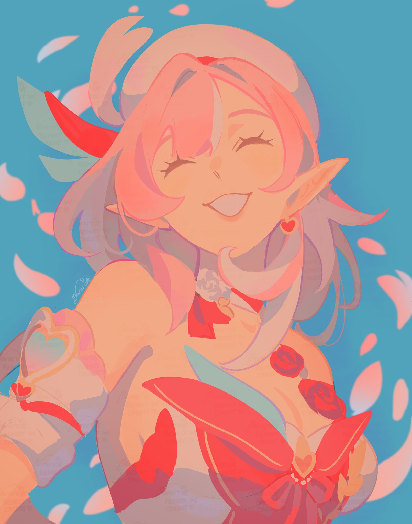 1girlbare shouldersberetblue skybreastscleavagedressearringselffalling petalshatheartheart earringsjewelrylarge breastsmulticolored hairpetalspink hairpointy earsred dressshort hairskysmilesolotwo-tone hairupper bodywhite hair