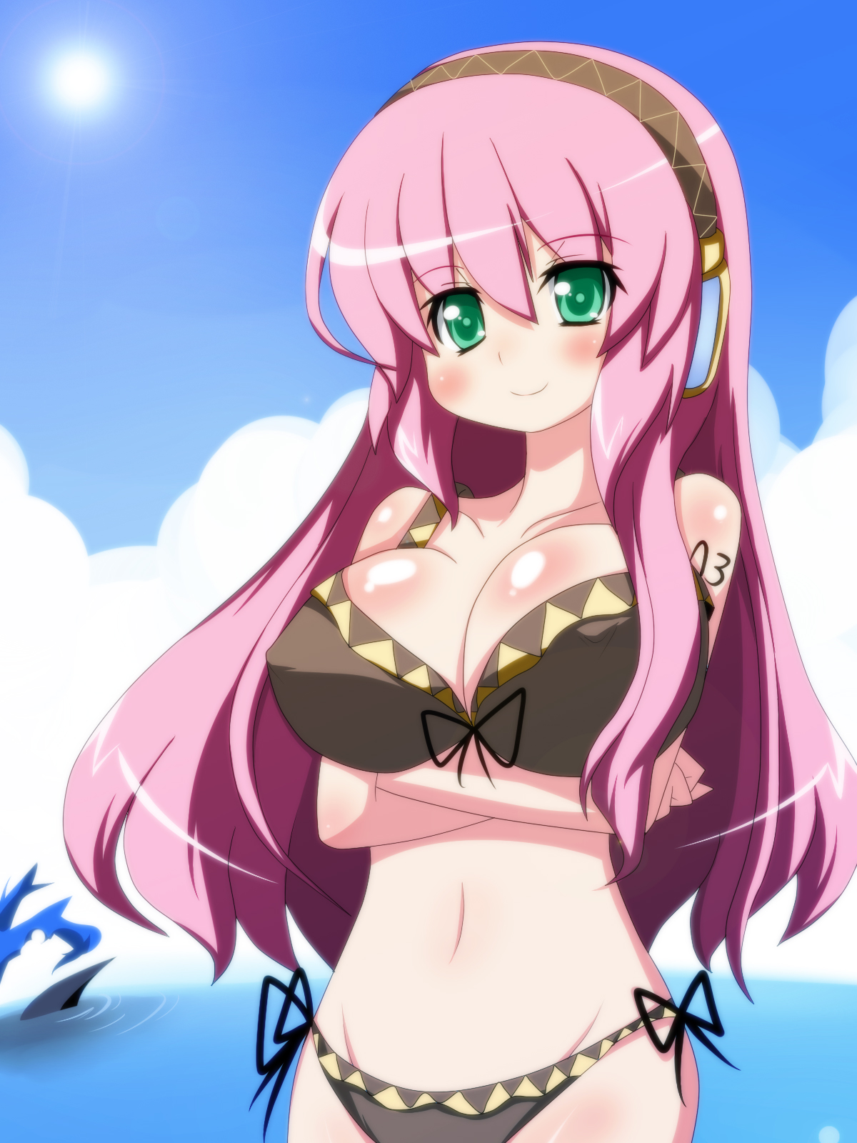 1girlbikiniblushbreastscrossed armsdayfemale focusgreen eyesheadphonesoutdoorspink hairskysmilesoloswimsuit