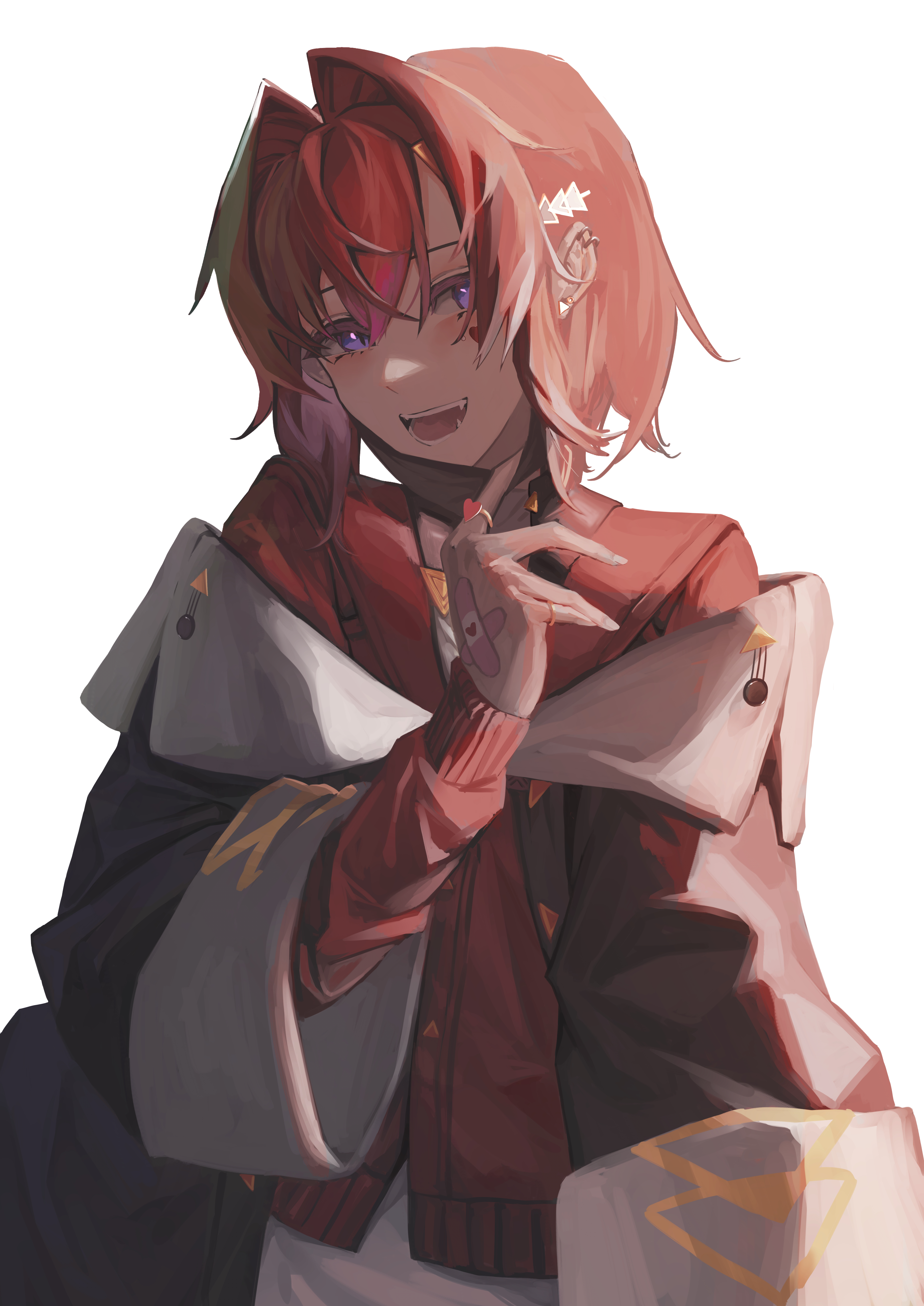 1girlbacklightingbandaidbandaid on handblack coatblushcardigancoatcrossed bandaidscrossed bangsear piercingearringsfacial markfangsgold ringhair intakeshair ornamenthand upheartheart facial markjewelrylong sleeveslooking at viewermaskmask pullmedium hairmouth maskmultiple earringsoff shoulderopen mouthpiercingpurple eyesred cardiganred hairsimple backgroundslit pupilssoloteethtriangle hair ornamentupper bodyvirtual youtuberwhite background