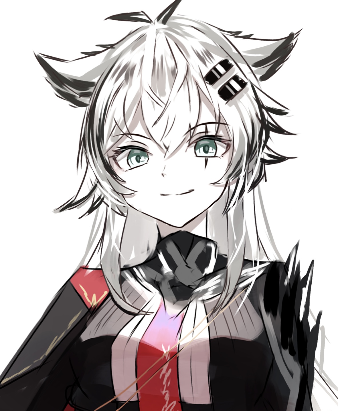 1girlblack hairblack jacketbolo tieclosed mouthgreen eyeshair between eyeshair ornamenthairclipjacketlong hairlooking at viewermulticolored hairportraitscarscar across eyescar on facesimple backgroundsmilesolosplit mouthstreaked hairwhite backgroundwhite hair