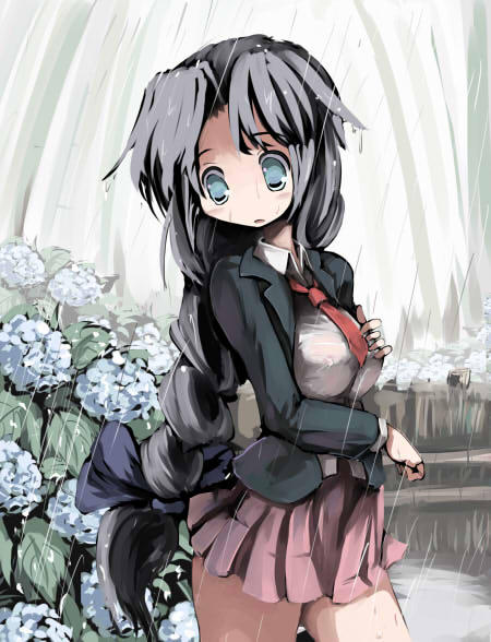 1girlblazerbowbraidbreastscosplayfemale focusflowergrey hairhair bowhydrangeajacketlong hairrainreisen udongein inaba (cosplay)skirtsolovery long hairwetwet clothes