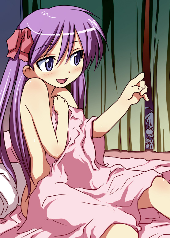 :d00s2girlsbedbed sheetblushmultiple girlsnaked sheetnudeopen mouthpurple hairribbonsittingsmile