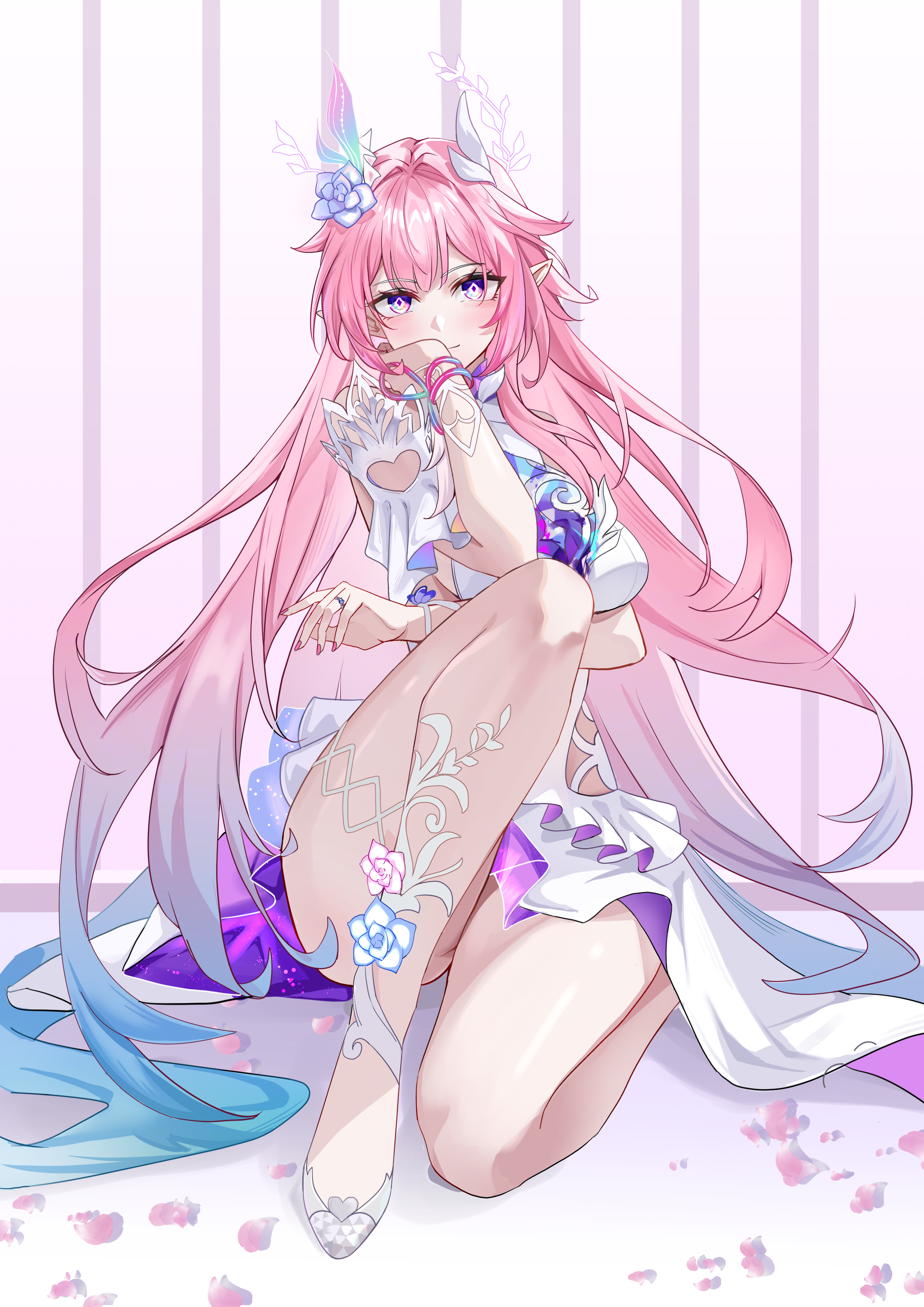 1girlaqua hairbreastsdiamond (shape)diamond-shaped pupilsdressflowergradient hairhair flowerhair ornamenthigh heelslarge breastslong hairlooking at viewermulticolored hairpink hairpointy earspurple eyessolosymbol-shaped pupilsthighsvery long hairwhite dresswhite hair