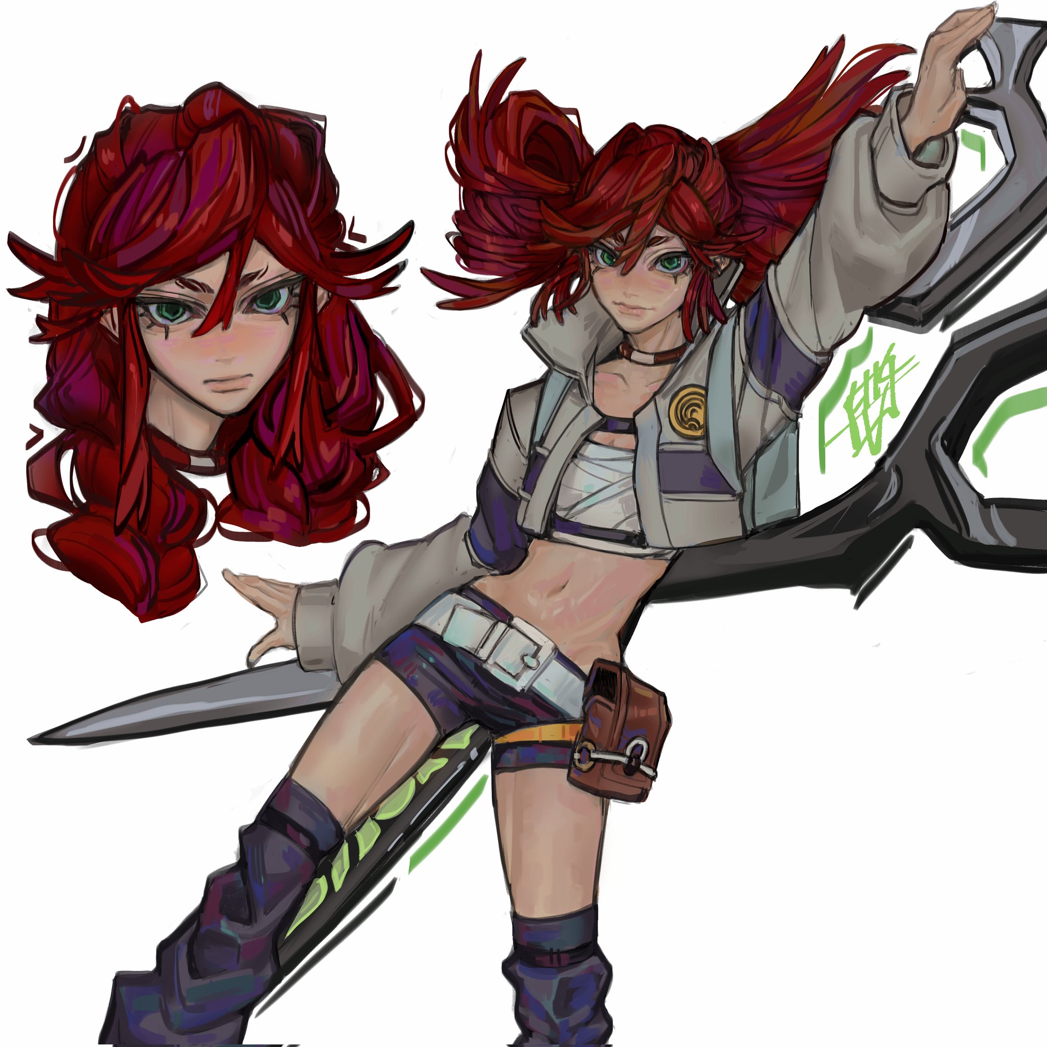 1girlbeltbig hairgreen eyesgrey jacketholdingholding scissorsjacketlong hairlooking at viewerred hairscissorsshortssimple backgroundskinnywhite belt