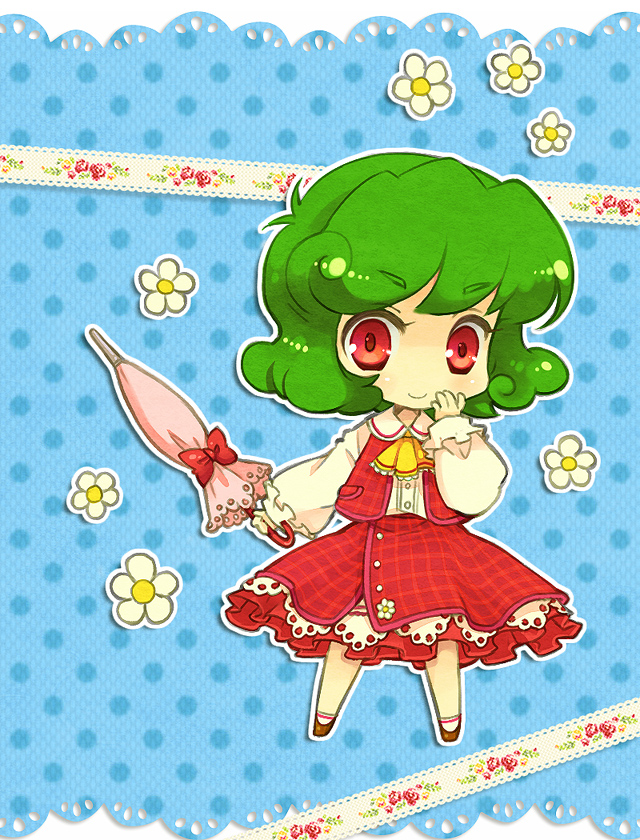 1girlascotchibiclosed umbrellafemale focusflowergreen hairparasolplaid clothesplaid skirtplaid vestred eyesshort hairskirtskirt setsoloumbrellavest