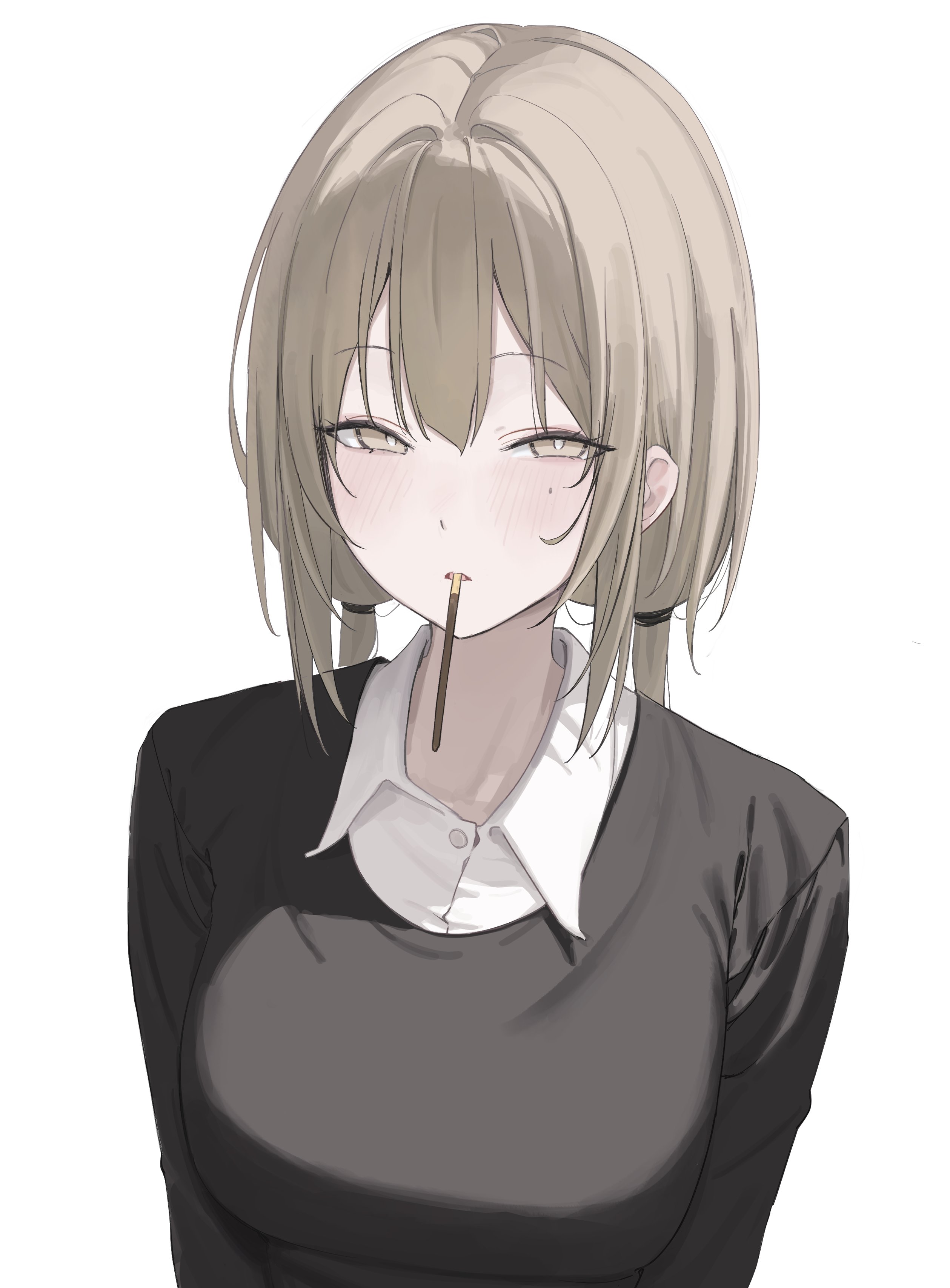 1girlblack sweaterblonde hairblushbreastscollared shirtfoodfood in mouthlarge breastslong hairlooking at viewerlow twintailsmolemole under eyenarrowed eyespockypocky in mouthraised eyebrowsshirtshirt under sweatersidelockssimple backgroundsolosweatsweatertwintailsupper bodywhite backgroundwhite shirtyellow eyes