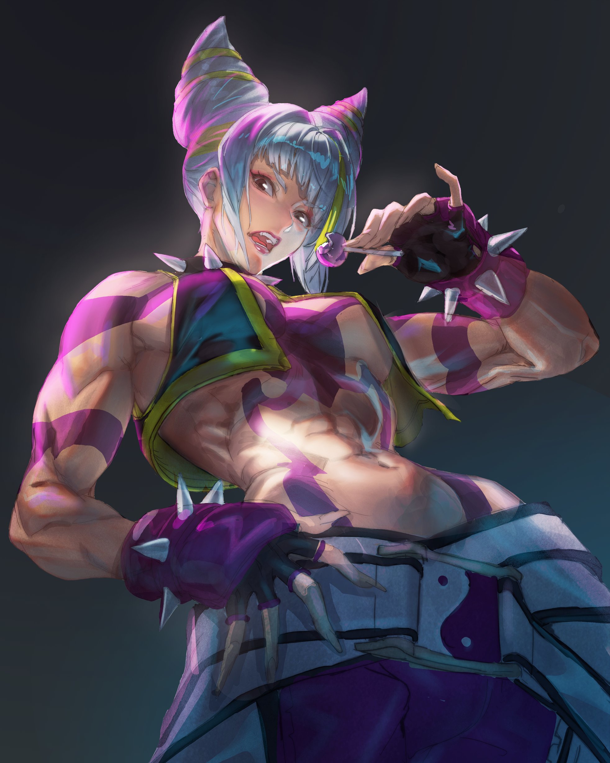 1girlabsalternate colorbraceletbreastscandycollarcrop topfingerless glovesfoodfrom belowglovesgrey hairhair hornsholdingholding candyholding foodholding lollipopjewelrylarge breastslollipoplooking at viewermidriffmuscularmuscular femalenavelofficial alternate coloropen mouthpantssolospiked braceletspiked collarspikes