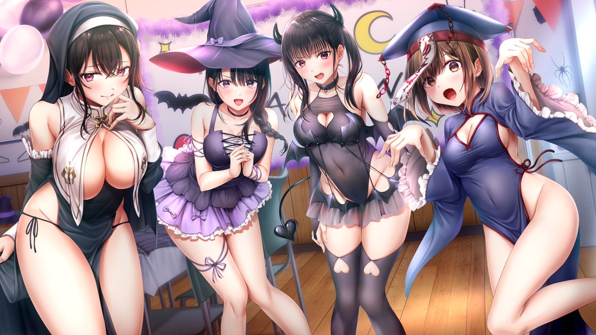 4girlsbare shouldersblack chokerblack hairblack hornsblack sleevesblack tailblack thighhighsblack vestbreast curtainsbreastsbrown hairchina dresschinese clotheschokercleavage cutoutclosed mouthclothing cutoutcovered naveldemon taildetached sleevesdressfake hornsfake tailhalloweenhalloween costumehatheart cutouthornsindoorsjiangshi costumelarge breastsleaning forwardlong hairlooking at viewermedium breastsmultiple girlsofudaopen mouthoutstretched armsown hands togetherpantiespelvic curtainpink eyespurple dresspurple eyespurple hatshort hairside-tie pantiessmilestandingstanding on one legtailthighhighstwintailsunderwearvestwitch hatzombie pose