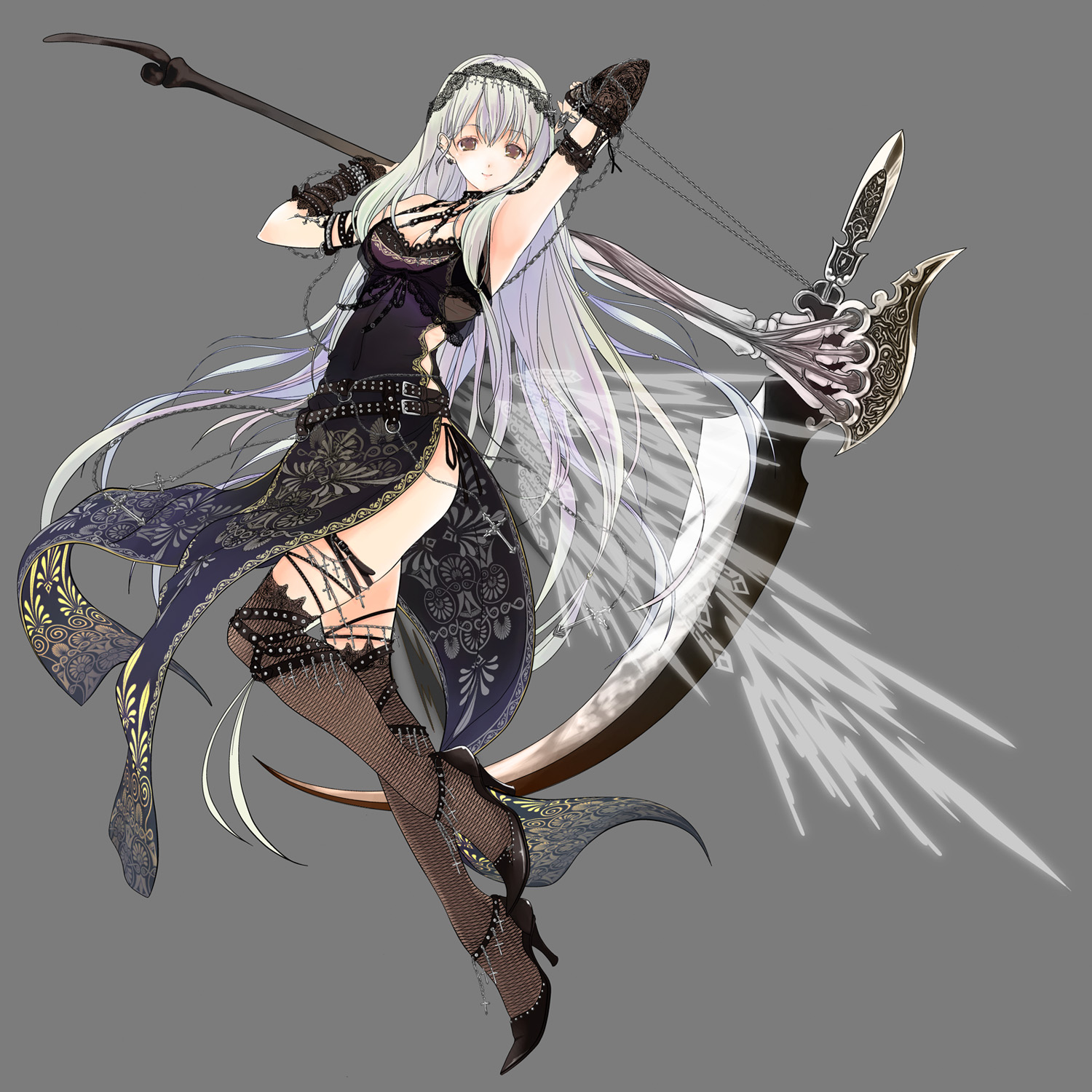 1girlarmpitsblack dressbreastsbrown eyeschaincleavagecrossdetached sleevesdressearringsfemale focusfull bodyhigh heelsjewelrylegslong hairmedium breastsscytheshoessimple backgroundsmilesolothighhighsvery long hairweaponwhite hair
