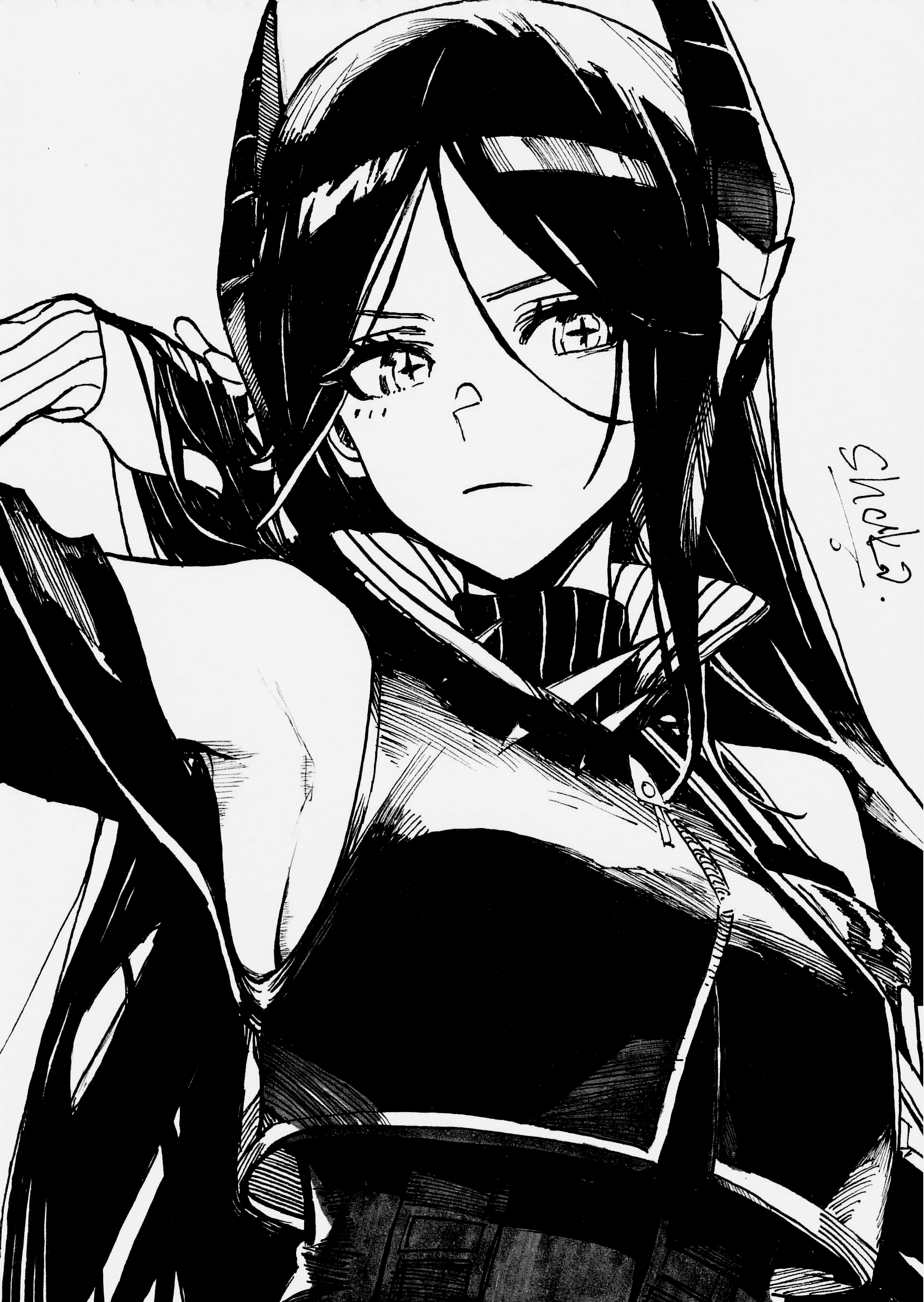 1girlarm upbare shouldersclosed mouthcross-shaped pupilsgreyscalehair between eyeshair lifthand in own hairlight frownlong hairlooking at viewermonochromeparted bangssignaturesimple backgroundsolosymbol-shaped pupilsupper bodywhite background
