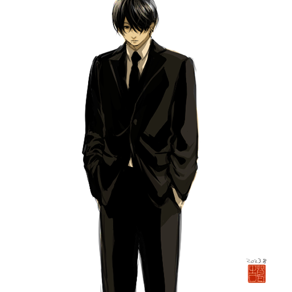 black hairblack necktieblack pantsblack suitcowboy shotdatedear piercingformal clotheshands in pocketsmale focusnecktiepantspiercingshort hairsolosuittsutakichi 02